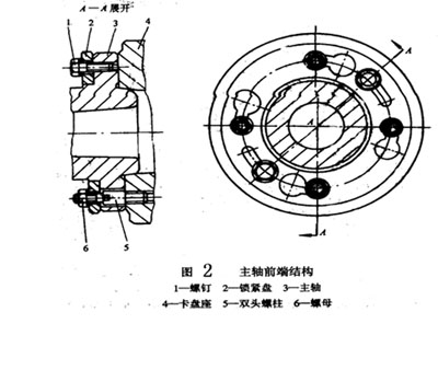 主軸前端采用短錐式結構。安裝時,使事先裝在撥盤或卡盤座4上的四個雙頭螺母通過主軸肩及鎖緊盤2的圓柱孔,然后將鎖緊盤2轉過一個角度,雙并沒有螺柱5外于鎖緊盤的溝槽內(nèi),并擰緊螺釘1和螺母6,就可以使卡盤或撥盤可靠地安裝在主軸的前端。這種結構裝卸方便,夾緊可靠,定心精度高;不高前端懸伸長度較短,有利于提高主軸組件的剛度,所以得到廣泛的應用。主軸軸肩右端面上的圓形撥塊用于傳遞轉矩。主軸尾端的圓柱面是安裝各種輔具的安裝基面。