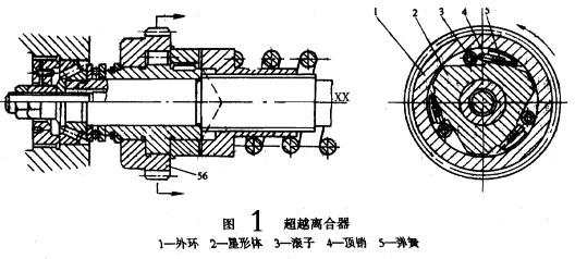 進(jìn)給過程中,當(dāng)進(jìn)給力過大或刀架移動受到阻礙時,為了避免損壞傳動機(jī)構(gòu),在溜板箱中設(shè)置有安全離合器M7,使刀架在過載時能自動停止進(jìn)給,所以亦稱之為進(jìn)給的過載保護(hù)裝置。安全離合器的工作原理見圖1,由光杠傳來的運(yùn)動經(jīng)單向超離合器的外環(huán)好齒輪Z56,并通過滾子傳給星形體見圖2,再經(jīng)過平鍵傳至M7的左半部1,然后由其螺旋形端面齒傳至離合器的右半部2,再經(jīng)過花鍵傳至ⅩⅩ,離合器的右半部2后端的彈簧3的彈力,克服離合器在傳遞扭矩時所產(chǎn)生的軸向分力,使離合器左、右部分保持嚙合見圖2a