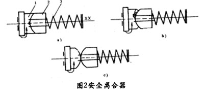 機(jī)床過載時,蝸桿ⅩⅩ上的阻力矩加大,安全離合器傳遞的轉(zhuǎn)矩也加大,因而作用在螺旋形端面齒上的軸向力也加大,當(dāng)軸向力超過規(guī)定值時,軸向力將超過彈簧3的彈性力,彈簧不再保持離合器左、右兩半相嚙合,于是軸向力便將離合右半部推開。見圖2b,這時離合器左半間1繼續(xù)旋轉(zhuǎn),而離合器右間部卻不能被帶動,所以在兩者之間產(chǎn)生打滑現(xiàn)象,見圖2c,使傳動鏈斷開,于是保護(hù)了傳動機(jī)構(gòu),使它們不致因過載而損壞。當(dāng)過載現(xiàn)象排除后由于彈簧3的彈力 ,安全離合器恢復(fù)嚙合,重新正常工作。