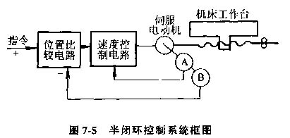 3)半閉環(huán)控制數(shù)控機(jī)床,這種控制方式對工作臺的實(shí)際位置不進(jìn)行檢查測量,而是通過與伺服電動機(jī)有聯(lián)系的測量元件,如測速發(fā)電機(jī)A和光電編碼盤B(或旋轉(zhuǎn)變壓器)等間接檢測出伺服電動機(jī)的轉(zhuǎn)角,推算出工作臺的實(shí)際位移梁,并與指令值進(jìn)行比較,用差值來實(shí)現(xiàn)控制(圖7-5)。這種控制方式工作臺沒有完全包括在控制回路內(nèi),精度沒有閉環(huán)高,調(diào)試卻比閉環(huán)方便。