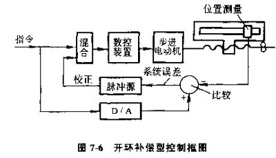 4)開換補(bǔ)償型數(shù)控機(jī)床,將上述三種控制方式的特點(diǎn)有選擇地集中起來,可以組成混合控制的方案。大型數(shù)控機(jī)床,需要高得多的進(jìn)給速度和返回速度,又需要相當(dāng)高的精度。如果只采用全封閉的控制,機(jī)床傳動鏈和工作臺全部置于控制環(huán)節(jié)中,安裝調(diào)試十分復(fù)雜,為了避免這些矛盾,可以采用混合控制方式。圖7-6為開環(huán)補(bǔ)償方式的組成框圖。它的特點(diǎn)是:基本控制選用步進(jìn)電動機(jī)的開環(huán)控制伺服機(jī)構(gòu),附加一個校正伺服電路。通過裝在工作臺上的直線位移測量元件的反饋信號來校正機(jī)械系統(tǒng)的誤差