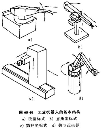 機(jī)器人的基本結(jié)構(gòu)有四種:直角坐標(biāo)、極坐標(biāo),圓柱坐標(biāo)和關(guān)節(jié)式坐標(biāo),見圖60-40。