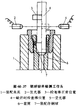 鋼球缺件檢測工作頭,圖60-37所示工作頭應(yīng)用光電檢測鋼球缺件,圖中檢測棒前端的直徑要比裝入的三個均布鋼球的內(nèi)接圓直徑略大。裝配正常時,檢測棒不能通過;當(dāng)缺少一個鋼球時則可通過。用光電檢測棒所在的軸向位置,即可判斷是否缺件。
