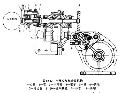 卡環(huán)的成形機(jī)構(gòu)及向活塞槽安裝卡環(huán)的機(jī)構(gòu),圖60-63所示機(jī)構(gòu)的主要元件是柱形心軸1、不轉(zhuǎn)動(dòng)的套2、推出器7和輥?zhàn)?。心軸1上開(kāi)有徑向槽,可以旋轉(zhuǎn),形狀為徑向槽開(kāi)始并沿其回轉(zhuǎn)進(jìn)程直徑逐漸變小的錐體。套2與心軸同軸并形成一個(gè)環(huán)形間隙,當(dāng)卡環(huán)毛坯一端被卡在心軸的徑向槽中時(shí),在環(huán)形間隙中加工出卡環(huán)的毛坯。套形推出器的外徑等于活塞上孔的直徑,安裝在環(huán)形間隙中并與心軸用鍵聯(lián)接,同時(shí)與帶軸向移動(dòng)和轉(zhuǎn)動(dòng)的驅(qū)動(dòng)裝置10和8相連。輥?zhàn)?位于把卡環(huán)3壓向心軸軸線(xiàn)的軸上,并通過(guò)傳動(dòng)比為1的齒輪6與心軸相連接。輥?zhàn)拥耐庑沃鸩皆龃蟆?/DIV>