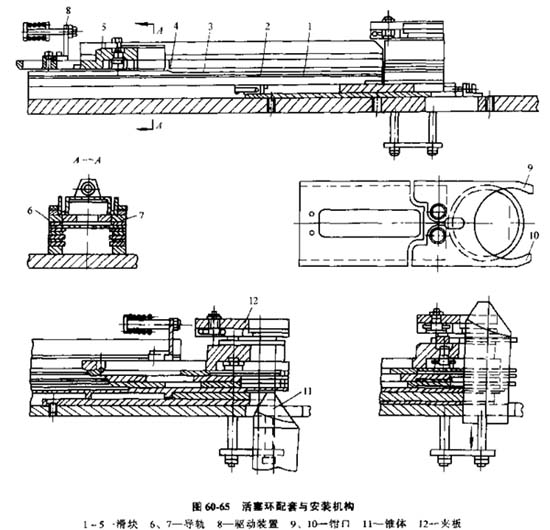 A. 在活塞槽中安裝活塞環(huán)的機(jī)構(gòu),圖60-65機(jī)構(gòu)做成盒子形狀,盒子的壁由滑塊1、2、3、4、5形成,每一個(gè)滑塊帶一套活塞環(huán)中、的一個(gè);瑝K依次安排在導(dǎo)軌6和7上。導(dǎo)軌具有斜角,可將活塞環(huán)壓在安裝基準(zhǔn)中,在起始位置上,這個(gè)些滑塊的端部構(gòu)成了一個(gè)朝向工作區(qū)的臺(tái)階,除最底下的一個(gè)滑塊外,每一個(gè)滑塊都有一塊擋鐵,作為推桿來推動(dòng)其下面的滑塊;上面的滑塊4與往復(fù)運(yùn)動(dòng)驅(qū)動(dòng)裝置8相連;瑝K的端部作成兩鉗口9和10,相互之間為彈性聯(lián)系。在導(dǎo)軌6和7上,滑塊按活塞環(huán)的給定高度配置。從專用的盒狀料倉中通過導(dǎo)軌的縫隙拉出活塞環(huán)。當(dāng)滑塊5運(yùn)動(dòng)時(shí),由于位于滑塊4槽上的擋鐵帶動(dòng)滑塊4,類似地使滑塊3等移動(dòng)。每一滑塊確定的間隙在自己的導(dǎo)軌上移動(dòng)。接著又沿導(dǎo)軌的斜面移動(dòng),滑塊一個(gè)個(gè)地堆積起來。此時(shí),每個(gè)活塞環(huán)以自己的大部分端面支撐在踝塊張開的爪上,并被上面滑塊壓住。