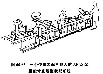 直線型柔性裝配系統(tǒng),圖60-66為一個適用于批量裝配生產(chǎn)的柔性裝配系統(tǒng),稱為可編程序裝配系統(tǒng)。在該系統(tǒng)中,裝配機器人是最重要的設(shè)備,不過還需要有傳送零件的輸送帶。機器人沿直線排列。裝配任務(wù)是在同一個底座裝配件裝上一個分裝配件,然后由輸送帶送到下一個裝配工位并再裝上另一個分裝配件。如此連續(xù)不斷的依次逐個裝上分裝配件,直至完成全部裝配工作。這種裝配方式最適合使用機器人。要求機器人不僅能完成裝配工作,而且要特殊的技巧或判斷,機器人不能勝任時,則由人工完成作業(yè)。