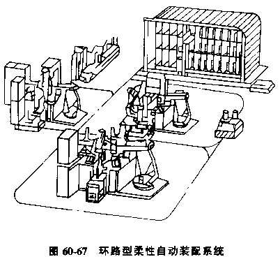 環(huán)路型柔性自動裝配系統(tǒng),一種環(huán)路型柔性自動裝配系統(tǒng)的基本特點是結(jié)構(gòu)不取決于特定的裝配順序。圖60-67為具有此特點的一個可裝配各種型號 的柔性裝配系統(tǒng)。該系統(tǒng)由三個子系統(tǒng)組成;可編程序裝配單元、系統(tǒng)存貯倉庫、柔性傳動系統(tǒng)。除這些子系統(tǒng)外,在裝配系統(tǒng)中還可加入特種功能的專門站,如檢驗站、清洗站和壓床等。