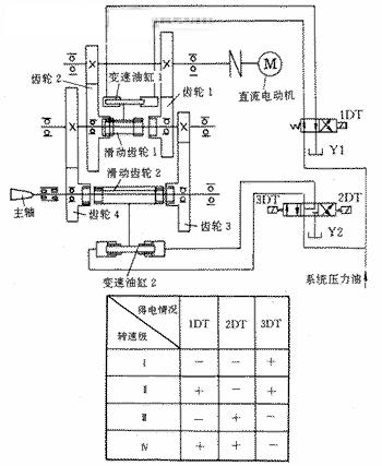 HC212ДФ1鏜銑床(主軸直徑220mm)是馬鋼機制公司90年代從俄羅斯進口的大型機床。該機床主軸調(diào)速是通過主軸箱內(nèi)一套變速機構(gòu)和直流調(diào)速電動機共同完成的。機械變速通過液壓系統(tǒng)來控制,使主軸獲得Ⅰ、Ⅱ、Ⅲ、Ⅳ4級轉(zhuǎn)速。其控制原理如圖1所示,電磁換向閥Y1和Y2分別控制變速油缸1和2,帶動撥叉使滑動齒輪1和2處于不同的工作位置,使主軸得到不同的轉(zhuǎn)速。其中變速油缸1有兩個工作位置,油缸2有3個工作位置。