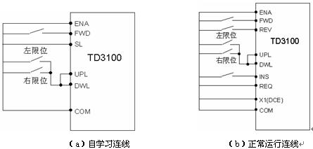 自學(xué)習(xí)連接線路如圖2(a)所示。將UPL和DWL短接,左限位與右限位并聯(lián),當(dāng)作平層信號(hào)輸入到UPL、DWL,自學(xué)習(xí)開(kāi)始的位置應(yīng)該從左端或者右端的限位外的位置開(kāi)始,如果不能夠離開(kāi)限位的位置,可以先自學(xué)習(xí)后,在正常運(yùn)行時(shí)通過(guò)調(diào)整平層距離調(diào)整F4.07或者層高1 F4.09來(lái)保證位置精度。設(shè)定F4.00為2,F4.01根據(jù)位置寬度來(lái)設(shè)定,用于自動(dòng)計(jì)算分頻系數(shù)。自學(xué)習(xí)時(shí),將FWD、SL端子合上,即開(kāi)始自學(xué)習(xí),注意在運(yùn)行到限位開(kāi)關(guān)動(dòng)作后,去除FWD命令,學(xué)習(xí)完成。查看F4.08和F4.09的值,看看是否正確記錄。如果加減速時(shí)間太長(zhǎng)或者過(guò)短,可以通過(guò)調(diào)整F3.11~F3.16來(lái)解決。