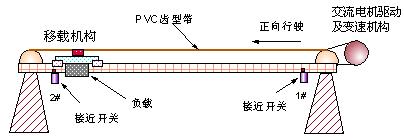 玻屏移載機(jī)的結(jié)構(gòu)如圖3所示,采用2.2kW電機(jī)驅(qū)動(dòng),電機(jī)額定電壓380V,額定工作頻率50HZ,額定電流5.0A,額定轉(zhuǎn)速1420r/m,減速比1:17,安裝有2個(gè)接近開(kāi)關(guān),其中1#和2#接近開(kāi)關(guān)之間距離大約1400~1800毫米,移載平臺(tái)帶負(fù)荷約150~170kg左右。移載機(jī)要求在兩個(gè)限位開(kāi)關(guān)之間運(yùn)動(dòng)和定位,定位精度誤差要求3毫米以內(nèi),單行程移動(dòng)完成時(shí)間大約2-3秒,即從1#限位開(kāi)關(guān)加速到恒速,再到減速停止在2#限位點(diǎn)的時(shí)間要求在2-3秒內(nèi)完成。