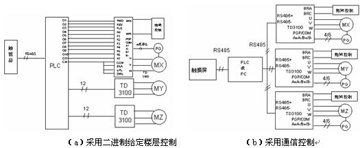 對(duì)于立體倉(cāng)庫(kù)、立體車庫(kù)這樣需要X、Y、Z三維多點(diǎn)定位運(yùn)動(dòng)控制的場(chǎng)合,采用TD3100實(shí)現(xiàn),可以大大簡(jiǎn)化電路,降低成本,提高可靠性。由于最高層數(shù)可以達(dá)到128層,因此采用給定目的樓層的距離控制,使用異常簡(jiǎn)單。采用TD3100立體倉(cāng)庫(kù)的系統(tǒng)如圖4所示,圖中UPL與DWL信號(hào)可以使用用戶的平層開(kāi)關(guān)信號(hào),也可以直接將UPL與DWL與COM短接。FLE為目的層使能端子,當(dāng)其有效時(shí),F1~F7的給定層信號(hào)有效;INI為當(dāng)前層初始化端子,其有效時(shí),恢復(fù)當(dāng)前層為F1~F7的給定層。從圖中對(duì)比可以看出,采用通信控制,線路簡(jiǎn)單,節(jié)省資源,節(jié)省成本。需要注意一點(diǎn)的是,目前該功能需要非標(biāo)定制。當(dāng)然該系統(tǒng)在應(yīng)用前還需要進(jìn)行層高自學(xué)習(xí),自學(xué)習(xí)方法同上節(jié)描述,只需要將總層數(shù)F7.00按照實(shí)際情況設(shè)定即可。