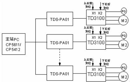 該功能的典型應(yīng)用主要應(yīng)用在類似智能數(shù)字舞臺(tái)控制這樣的多電機(jī)多軸高精度距離控制系統(tǒng)中。采用PROFIBUS-DP現(xiàn)場(chǎng)總線控制的現(xiàn)代舞臺(tái)驅(qū)動(dòng)系統(tǒng)如圖5所示。該系統(tǒng)采用PC機(jī)控制,內(nèi)置西門子插卡式PROFIBUS主站控制板CP5611或者CP5412均可,實(shí)現(xiàn)手動(dòng)和自動(dòng)控制。適配器采用EMERSON生產(chǎn)的PROFIBUS-DP適配器TDS-PA01與TD3100直接接口。采用PROFIBUS控制的目的是,由于舞臺(tái)控制電機(jī)較多,可以達(dá)到較高的實(shí)時(shí)控制精度和較快的響應(yīng)時(shí)間,達(dá)到既快又準(zhǔn)的目的。