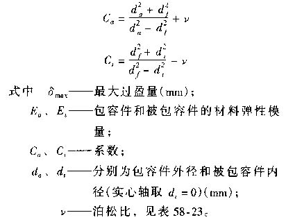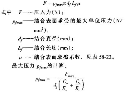 6)用壓力機壓入時,壓入前應根據(jù)零件的材料和配合尺寸,計算所需的壓入力。壓力機的壓力一般應為所需壓入力的3~3.5倍,壓入力的計算方法如下: