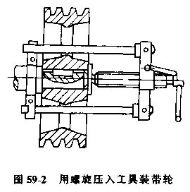A) 圓錐軸頸,擋圓軸向固定,b)軸肩、擋圓軸向固定,c)楔鍵周向、軸向固定,d)隔套、擋圈軸向固定安裝帶輪前,先按軸的軸轂孔的鍵槽修配鍵,然后清理安裝面并涂上潤滑油。用木錘或銅棒將帶輪輕打到軸上,或用螺旋等壓入工具將帶輪壓到軸上,見圖59-2。