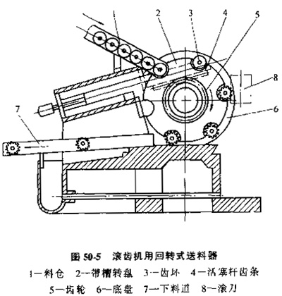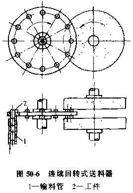 A.回轉式送料器,圖50-5是滾齒機上用的回轉式送料器,當帶狗槽的轉盤旋轉時,槽口順次經(jīng)過料倉的靠口處,單個工件落入槽口。轉盤外圓柱面為工件止動面兼隔料作用。隨著轉盤的間歇轉動,坯料被送到加工工位,加工完的工件被送至下料道。