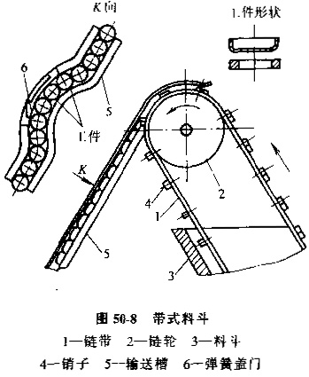 抓取法定向利用運動的定向機構抓取工件的某些表面,。如孔、凹槽等,使之從成堆的雜亂工件中分離出來,并定向排列。圖50-8所示的帶式料斗,適用于碗狀、蓋狀和環(huán)狀零件的自動定向。裝有銷4的鏈帶1在連續(xù)運動時,堆在料斗3中的工件被銷子4掛住,依次送入輸送槽5,當槽5中料滿時,銷子1仍帶工件擠入槽5,槽上彎曲部分的彈簧蓋門6被打開,多余的工件落入外料箱。