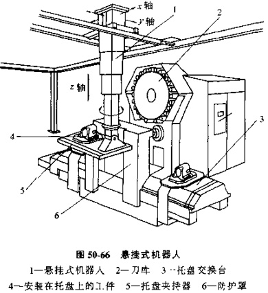 采用空架導(dǎo)軌的懸掛機器人,也屬于一種變化發(fā)展出的有軌小車,見圖50-66。在廠房內(nèi)安裝了架在空中的導(dǎo)向?qū)к,懸掛式機器人可以由電動機拖動在導(dǎo)軌上行走,工件以及安裝工件托盤,可以由機器人的支持架托起,并可上下移動和旋轉(zhuǎn)。由于機器人可以自由地在x、y方向上移動,它就可以將工件連同托盤移動到導(dǎo)軌允許到達的任意位置上交換托盤和工件。