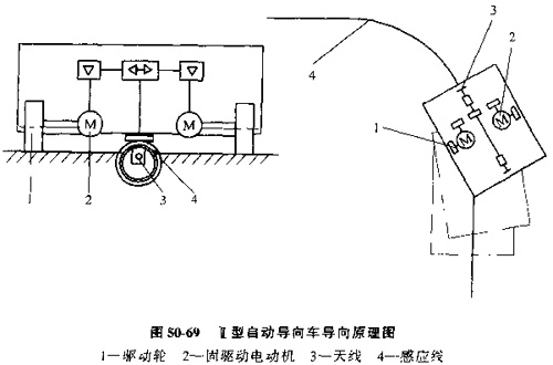 圖50-69所示是Ⅱ型自動導(dǎo)向車的導(dǎo)向原理圖。當天線3偏離導(dǎo)向感應(yīng)線4的左右任一側(cè)時。大線中的一對線圈的輸入信號(感應(yīng)電壓)就產(chǎn)生了信號差,通過控制系統(tǒng),使左右兩驅(qū)動電動機2產(chǎn)生轉(zhuǎn)速差,經(jīng)驅(qū)動輪1使小車沿感應(yīng)線轉(zhuǎn)向,甚至信號差為零。