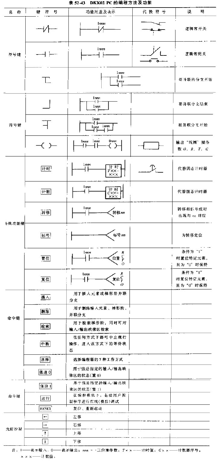 計(jì)時(shí)器32個(gè),計(jì)時(shí)范圍(0.1~9.9s),中間記憶256個(gè),順序控制的工程步進(jìn)器10個(gè),每個(gè)32步,外形尺寸485mm×220mm×150mm。該控制器特別適合于老設(shè)備的技術(shù)改造,用DKK02PC代替常規(guī)的繼電器邏輯控制可直接按原來(lái)的控制線(xiàn)路進(jìn)行編程,只是符號(hào)做一些變換,DKK02PC的編程方法及功能見(jiàn)表52-43。