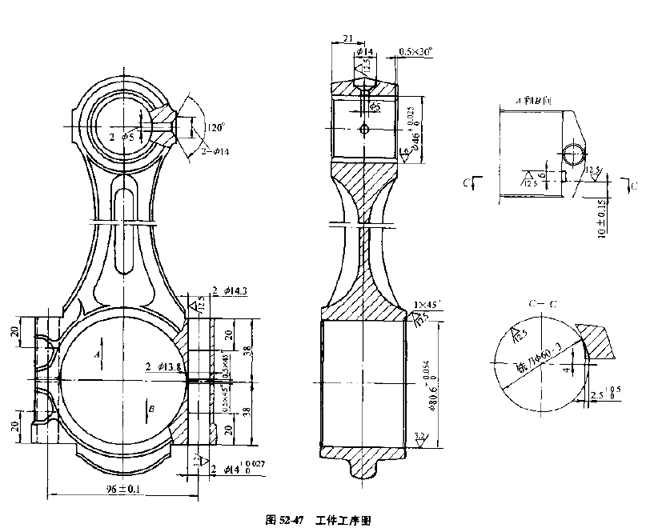 該自動線用于連桿大,小頭孔粗加工,半精加工及螺釘孔加工,加工工件見圖52-47,工件材質(zhì)為45鋼。