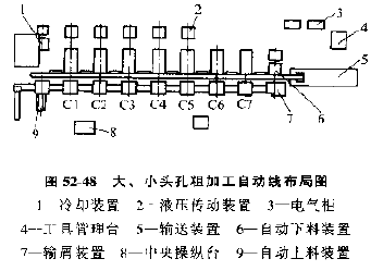 自動線總布局見圖52-48,圖52-49、圖52-50,三條自動線由20臺機床組成,每條自動線都有單獨的自動上下料裝置。