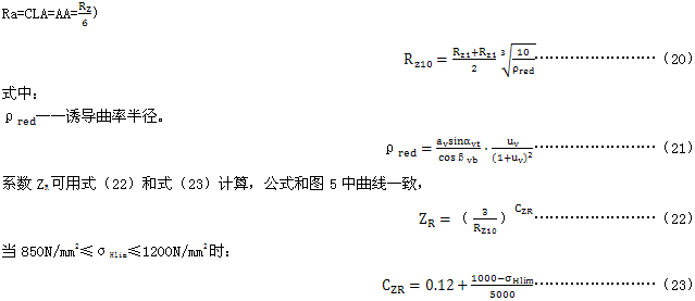 根據(jù)14.2的規(guī)定,粗糙度系數(shù)ZR是考慮齒面狀況對接觸疲勞(點蝕)強度的影響。圖5中的粗糙度系數(shù)曲線是Rz10和配對齒輪中較軟齒輪材料σHlim的函數(shù)。該圖對節(jié)點處誘導(dǎo)曲率半徑 的齒輪副是有效的。
