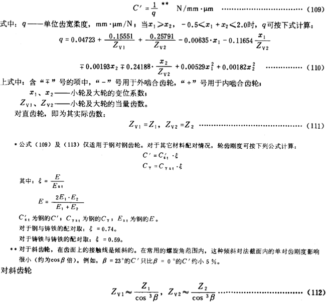 當(dāng)齒圈及輪輻很薄時(shí),C′可較剛性齒輪降低50%。在端面重合度εα>1.2時(shí),可近似取單對齒嚙合區(qū)上界點(diǎn)處的C′作為最大剛度,也可將公式(109)的計(jì)算結(jié)果約降低10%使用。