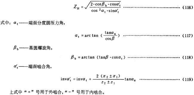 ZH數(shù)值可由式(116)計(jì)算得出。對于具有法面齒形角αn為20°,22.5°,25°的內(nèi)、外嚙合齒輪,ZH也可由圖22,圖23和圖24根據(jù)比值(x2±x1)/(z2±z1)及螺旋角β查得。