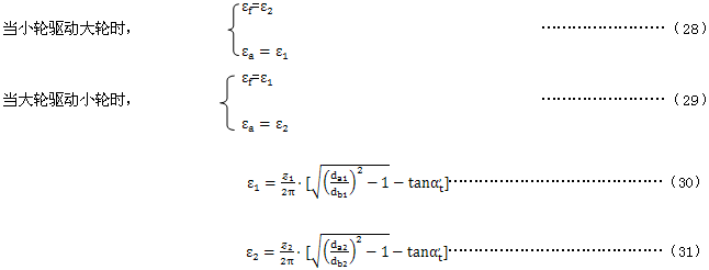 重合度系數(shù)Kε是考慮在忽略載荷分配時,將小輪齒頂?shù)拈W溫值轉(zhuǎn)換為沿嚙合線閃溫平均值的系數(shù)。重合度系數(shù)可以用齒高重合度ε1與ε2以及它們的和εa來表示。Xε的公式是基于假定沿嚙合線的閃溫是線性分布的。這種方法的可能誤差將不會超過5%,且偏于安全。