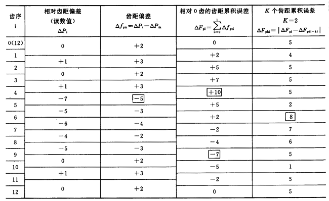 從逐齒測量數(shù)據(jù)中求取Δfpt、ΔFp、ΔFpK的方法見表8。以Z=12,K=2的齒輪為例。