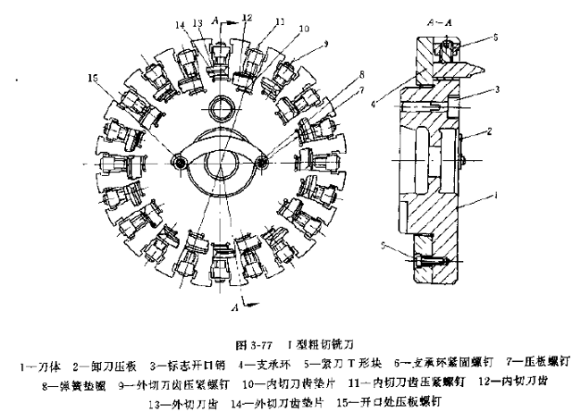 Ⅰ型雙面及三面粗切銑刀用于粗加工弧齒錐齒輪和準(zhǔn)雙曲面齒輪副中的大、小齒輪。該銑刀刀體硬度高、剛性好、刀齒采用T型塊夾緊,結(jié)構(gòu)緊湊,刀齒數(shù)量多,且裝卸靈活方便,銑刀有A、B兩中型式的錐孔直徑,A型孔適用于國產(chǎn)機(jī)床,B型孔適用于進(jìn)口格里森機(jī)床或新型仿制機(jī)床。銑刀公稱直徑有3.75,4.5,5,6,7,5,9,10.5,12,14,16,18in等十一種,其結(jié)構(gòu)型式和基本尺寸見圖3-77和表3-152~153。