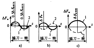 插齒時,有三個基本因素對產生△Fw值是有影響的,首先就是機床分度蝸輪副的運動誤差(運動偏心),由于分度蝸輪副運動偏心所產生的公法線長度變動量是正弦曲線時,每個分度蝸輪副的誤差相加后得出公法線長度的總誤差,其值不僅與分度蝸輪副的原始誤差有關,而且與正弦曲線的相位移有關,同時也與插齒刀與工件齒數間的比例關系有關。如果插齒刀與工件齒數相等或成整數倍的話,那么在正弦曲線方向相同的條件下,總誤差Fw將減小(圖1a)。當正弦曲線方向不同時,根據不同的相位距Fw值或可能沒有變化 (圖1b)或達到最大值(圖1c)。因此可以說,甚至在插削相同工件時,也可能產生不同的原始誤差總值。
