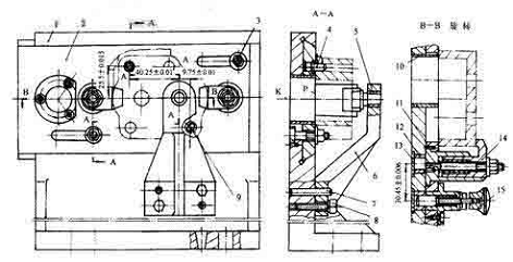 1.夾具體 2.移動分度塊 3.鎖緊螺母 4.圓柱定位銷 5、12.襯套 6.支承座 7.圓柱銷 8.螺釘 9.削邊定位銷 10.防屑套 11.騎縫銷 13.密封塊 14.鉤形壓板機構 15.分度對定機構