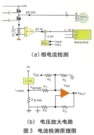 電流檢測 電機(jī)電流檢測電路可提供重要的反饋信息,將該信息與來自主控DSP的控制信號相結(jié)合,可以控制MOSFET或IGBT的柵極驅(qū)動芯片并最終調(diào)整電機(jī)速度。如果要實(shí)現(xiàn)過流保護(hù),還必需進(jìn)行電流監(jiān)控,不過對于低端應(yīng)用而言,傳統(tǒng)的過流保護(hù)卻顯得過于昂貴。電流采樣的方案是在逆變橋的下橋臂串一0.027Ω采樣電阻如圖3(a),采樣電流范圍為0~6.22A,采樣后的電壓放大倍數(shù)為14.63倍,放大電路如圖3(b),并經(jīng)2.5V電壓抬升輸入DSP,所以輸入DSP的電流模擬電壓量為: UAD=2.5+I×0.027×14.63。 MotionChip AD口的模擬量輸入電壓為0~5V,所以電流采樣經(jīng)量化的值為: