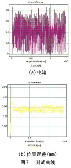 用戶操作界面功能有: •參數(shù)設(shè)置與顯示模塊主要是設(shè)置一些系統(tǒng)參數(shù)(如掃查長度,探測寬度)和控制參數(shù)(如速度參數(shù)、加速度參數(shù)等); •任何時刻,控制程序都時刻監(jiān)視系統(tǒng)的運(yùn)行狀況,隨時對系統(tǒng)故障做出相應(yīng)的處理。 軟件部分包括X向運(yùn)動和Y向的掃查運(yùn)動,數(shù)據(jù)存儲及處理,手動控制,故障處理,運(yùn)動狀態(tài)顯示及故障顯示等。操作界面(GUI)給予清晰、簡單的用戶界面,方便用戶調(diào)試、運(yùn)行,同時能夠?qū)⑺欧?qū)動器傳遞過來的信息顯示出來,便于監(jiān)控。任務(wù)編程模塊將要實(shí)現(xiàn)控制任務(wù)的規(guī)劃,如X軸向和Y軸向運(yùn)動等,包括故障查詢、處理。 運(yùn)行效果 智能伺服驅(qū)動器性能的好壞直接決定整個系統(tǒng)設(shè)計(jì)的成敗,為此用一直流電機(jī)對驅(qū)動器進(jìn)行測試,電機(jī)的電流和位置誤差如圖7(a)、(b)所示,從圖7中可以看出,驅(qū)動器的響應(yīng)時間只有0.12s,位置誤差很小。通過對通訊速度及上位機(jī)控制命令的測試顯示,在實(shí)時性要求不是非常嚴(yán)格的情況下,以RS232串口或者485串口的通訊速率是完全可以滿足系統(tǒng)需求的。