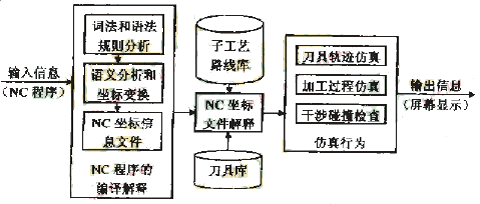 本文設(shè)計的數(shù)控車削仿真系統(tǒng)既可以對手工編制的單機(jī)數(shù)控車削程序進(jìn)行仿真,也可以作為CAD/CAPP/CAM集成制造系統(tǒng)中的一個子系統(tǒng),對集成制造系統(tǒng)自動產(chǎn)生的數(shù)控車削程序進(jìn)行仿真。該系統(tǒng)可以完成對子程序的處理,允許運(yùn)動坐標(biāo)的續(xù)效代碼和注釋行的存在,并且支持多種數(shù)控代碼格式,是一個通用的數(shù)控車削NC 程序仿真系統(tǒng),其工作流程如圖1所示。