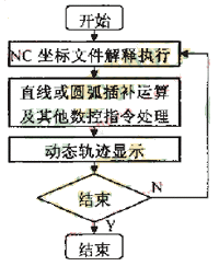 刀具軌跡動態(tài)仿真是根據(jù)要進(jìn)行仿真的數(shù)控代碼,在計算機(jī)屏幕上動態(tài)顯示刀具軌跡,以運(yùn)動軌跡的方式來直觀顯示零件具體的加工過程;進(jìn)行刀具軌跡動態(tài)仿真時,順序讀入NC坐標(biāo)信息文件,獲取數(shù)控指令(直線、圓弧指令等)和命令參數(shù)(起點、終點和圓心坐標(biāo)等),然后執(zhí)行相應(yīng)的軌跡處理:對于直線和圓弧命令,則要根據(jù)其起止運(yùn)動坐標(biāo),進(jìn)行直線和圓弧的插補(bǔ)運(yùn)算,得到運(yùn)動過程中離散的中間點的坐標(biāo)值,然后動態(tài)顯示刀具運(yùn)動軌跡。刀具運(yùn)動軌跡仿真算法流程如圖2所示。