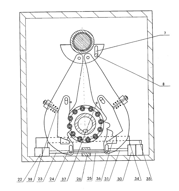 | 一種減速機(jī),其特征是輸入軸是偏心軸(2),偏心軸(2)中間偏心外圓上設(shè)置3-12個外套(32),每個外套(32)上分別連接連桿(27)位于殼體(1)內(nèi)一側(cè),每個連桿(27)連接能與滾輪(13)邊緣上的滾子輪(10)嚙合的鉤齒板(16);在工作時至少有1個鉤齒板(16)和對應(yīng)滾輪(13)邊緣上的滾子輪(10)嚙合,每個滾輪(13)邊緣上裝有5-80個滾子輪(10),上述所述的連桿(27)上裝有與滾輪(13)邊緣上的滾子輪(10)嚙合的鉤齒板(16)與對應(yīng)的3-12個滾輪(13)分別固定在輸出軸(12)上,且兩個相鄰滾輪邊緣上的滾子輪(10)在橫向排列上相位差是一個等值弧度,在連桿(27)上設(shè)置有定位槽(24),固定銷(21)設(shè)置在連桿(27)定位槽(24)內(nèi)位于殼體(1)內(nèi),鉤齒板(16)背面設(shè)置有彈性復(fù)位裝置。 |
