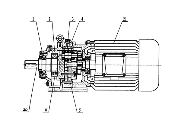 一種減速機,電機(21)與針齒殼(4)聯(lián)接,針齒殼(4)與機座(2)聯(lián)接,其特征在于,空心行星架裝置(6)通過軸承設于機座(2)內,并與裝在針齒殼(4)內的針齒銷(3)、擺線片(5)產生關聯(lián),太陽輪(13)與電機(21)的電機軸(12)連接,輸出軸(20)和空心行星架(6)整合為一體延伸至機座(2)外。