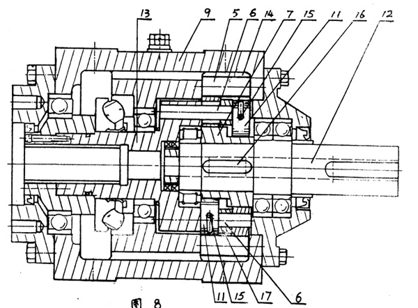 一種滾齒減速機(jī),由偏心輪激波器驅(qū)動作為行星輪構(gòu)件的內(nèi)齒輪,使其和外環(huán)固定的針齒依序嚙合,其特征在于內(nèi)齒輪為由多個能自由滾動的圓柱滾筒形滾齒11環(huán)繞排列于激波器之偏心輪外周而構(gòu)成的滾齒齒輪,各滾齒11內(nèi)有與輸出軸13連接的輸出軸銷6,外以托環(huán)15托住。