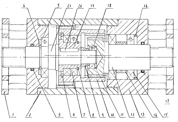 一種潛油減速機,由左端蓋、內(nèi)齒輪、O形圈、擋圈、軸承、定距套、雙聯(lián)齒輪、調(diào)整環(huán)、齒輪軸、右端蓋、偏心套、鍵、軸組成,其特征是:左端蓋內(nèi)裝O形圈,在軸上安裝軸承并用擋圈固定,將軸裝在左端蓋上,把鍵裝在軸右端,并將偏心套裝在軸上,在雙聯(lián)齒輪上安裝擋圈及軸承,并一起裝在偏心套上,用擋圈固定,定距套裝在軸的右端,內(nèi)齒輪與左端蓋靠螺紋連為一體,右端蓋內(nèi)裝O形圈,并安裝調(diào)整環(huán)、軸承、定距套,在齒輪軸左端裝調(diào)整環(huán)和軸承,并一起裝入右端蓋內(nèi),連同整體靠螺紋與內(nèi)齒輪連為一體。左端蓋與電動機把合,右端蓋與油泵把合。