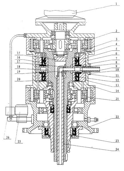 一種雙出軸噴液擺線減速機,包括有輸出軸(23)、中間輸出軸(3)、擺線輪(2)和(21)以及中間法蘭(14),其特征在于中間法蘭(14)中設有輸入接管(9),該輸入接管(9)與液體管外套(8)聯(lián)結,所述輸入接管(9)通過管接頭(19)橫向進入中空的中間輸出軸(3)內,所述中間輸出軸(3)與管彎頭(17)聯(lián)接后再與液體輸出管(24)接通。