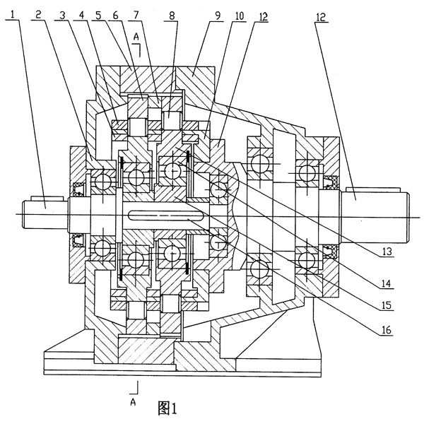 | 一種內(nèi)曲線減速機(jī),包括輸入軸、端蓋、殼體、機(jī)座、輸出軸和減速機(jī)構(gòu),輸入軸通過支承軸承與端蓋連接,輸出軸通過另一套支承軸承與機(jī)座連接,所述端蓋、殼體、機(jī)座互相連接構(gòu)成減速機(jī)外殼,所述減速機(jī)構(gòu)為輸入軸上安裝有偏心套,偏心套上安裝有圓柱滾動軸承,殼體內(nèi)孔固定裝有內(nèi)齒圈,圓柱滾動軸承和內(nèi)齒圈之間套有傳動圈、與輸出軸固連,沿傳動圈外圓軸向開有等分導(dǎo)槽,其與傳動圈內(nèi)環(huán)槽形成通孔,各等分導(dǎo)槽內(nèi)通孔兩側(cè)裝有擋塊,各通孔中裝有可作徑向往復(fù)運(yùn)動的滾動體,其特征在于: (1) 所述圓柱滾動軸承外圈裝有緊配合的激波套,激波套外圓可在傳動圈內(nèi)環(huán)槽中作偏心旋轉(zhuǎn)運(yùn)動,所述滾動體與激波套外圓和內(nèi)齒圈曲線形內(nèi)圈接觸,在傳動圈通孔中運(yùn)動, (2) 所述偏心套由兩單片偏心套組成,相互錯(cuò)位180°,相應(yīng)圓柱滾動軸承、激波套、滾動體、內(nèi)齒圈均為兩套,共用一付具有兩道內(nèi)環(huán)槽的傳動圈。 |