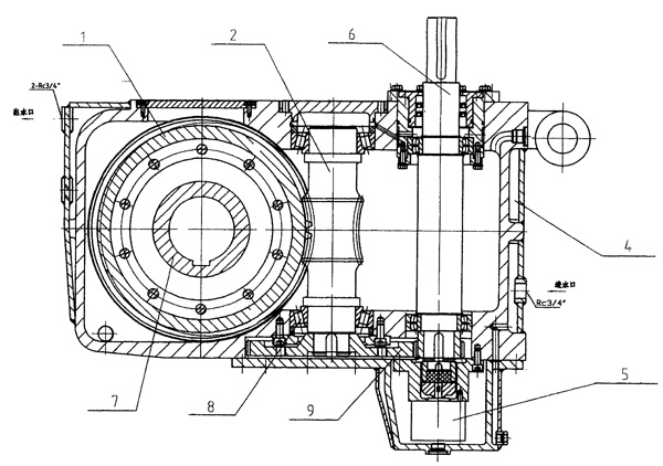 | 一種拉矯機(jī)蝸輪減速機(jī),它是由輸入軸、軸承、斜齒輪副、蝸輪、蝸桿、密封圈、潤滑油泵、夾層水套箱體、空心輸出軸組成,其特點在于:輸入軸(6)與蝸桿(2)是立式軸,蝸輪軸為空心輸出軸(7),它是水平軸,電機(jī)為立式變頻電機(jī),蝸輪(1)采用高強(qiáng)耐磨材料,空心輸出軸(7)的兩端裝有骨架橡膠密封圈(3),潤滑油泵(5)為雙向油泵,該蝸輪減速箱的動力由立式電機(jī)輸入,經(jīng)輸入軸(6)下面的斜齒輪(9),將動力傳給蝸桿(2),蝸桿(2)與蝸輪(1)嚙合,由空心輸出軸(2)將動力傳給拉坯輥,軸承(8)分別裝在三根軸的兩端,固定在箱體上。 |