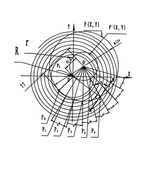 | 一種擺線蝸盤減速機(jī),由機(jī)架、底板和機(jī)身所組成,其特征在于:它由擺線盤,滾盤和機(jī)架組成, 擺線盤由盤體,Ⅰ軸組成,Ⅰ軸緊固于盤體左側(cè)中心孔內(nèi),盤體為圓盤狀,它的前側(cè)面為錐形,錐面為“類單葉雙曲面”,面上有曲線槽,這曲線為“雙勻速擺線”公式為: *** 其中R。遥蛉 溃颍;曲線槽的法向切面形狀及各部份幾何參數(shù)計算關(guān)系的標(biāo)準(zhǔn)化同于齒輪、齒條,或類似于梯形、鋸齒螺紋的幾何關(guān)系; 滾盤由盤身,Ⅱ軸以及K個滾輪、小軸、小套、鎖母組成;盤身為圓盤狀,它的中心右側(cè)固定著Ⅱ軸,盤周有K個斜孔,斜孔內(nèi)有螺紋配合著小套,小套左端由鎖母鎖定,小軸右端固定著滾輪,小軸的滾輪左側(cè)及小軸左端有軸承安裝于小套內(nèi);滾輪為單片錐形圓盤狀,它的H側(cè)面為凹錐面或平面,另一J側(cè)面為錐面;滾輪與擺線盤嚙合時它的H側(cè)凹錐面與曲線槽的凸側(cè)面相靠,J側(cè)錐面與曲線槽的凹側(cè)面相靠,這H、J兩側(cè)面交角d取曲線槽兩側(cè)齒形壓力角的和; 機(jī)架由機(jī)身,左蓋、右蓋、左壓盤、右壓盤組成;機(jī)身是下部有底板的圓筒,底板是四周有安裝孔的平板,左蓋、右蓋均為盤形,它們分別安裝于機(jī)身的左、右兩端面,左蓋中心固定有與其中心線有一偏斜角的斜套,斜套孔內(nèi)用軸承安裝著Ⅰ軸,左壓盤固定于斜套左端,它是緊壓Ⅰ軸左端軸承外圈的圓盤,它中心有孔,用密封圈套于Ⅰ軸左部;右蓋中心固定有大套,大套孔內(nèi)用軸承安裝著Ⅱ軸,右壓盤固定于大套右端,它是緊壓Ⅱ軸外端軸承外圈的圓盤,它中心有孔,用密封圈套于Ⅱ軸右部;Ⅰ、Ⅱ軸均伸出機(jī)架,兩軸中心距為R+r,滾盤一側(cè)的滾輪與擺線盤一側(cè)的曲線槽達(dá)正確嚙合而另一側(cè)為分離狀態(tài)。 |