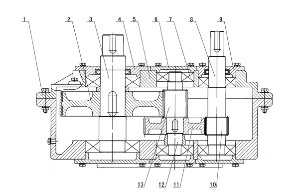 | 齒輪減速機,包括箱體和活動支撐在箱體上的主傳動軸、中間傳動軸以及被動傳動軸,箱體通過螺栓固定連接端蓋,主傳動軸上安裝一主齒輪,中間傳動軸上安裝一被齒輪和二主齒輪,被動傳動軸上安裝二被齒輪,一主齒輪與一被齒輪相嚙合,二主齒輪與二被齒輪相嚙合,其特征在于:一主齒輪(10)與一被齒輪(11)的模數(shù)為2,二主齒輪(13)與二被齒輪(2)為模數(shù)3.5的雙圓弧齒。 |