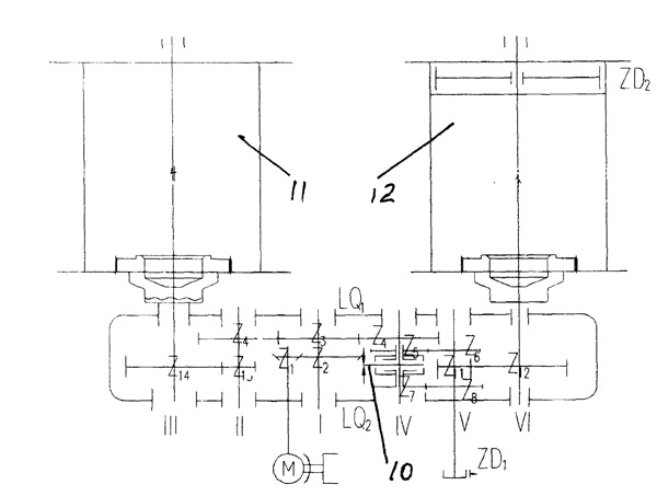 起升變幅減速機(jī),有驅(qū)動(dòng)電機(jī)、主起升卷筒、動(dòng)臂變幅卷筒,驅(qū)動(dòng)電機(jī)的輸出齒輪分別與主起升卷筒、動(dòng)臂變幅卷筒之間設(shè)有齒輪變速機(jī)構(gòu),驅(qū)動(dòng)電機(jī)的輸出齒輪與動(dòng)臂變幅卷筒之間的齒輪變速機(jī)構(gòu)還帶有同步器。省去了主起升卷筒、動(dòng)臂變幅卷筒之間單獨(dú)設(shè)置的齒輪傳動(dòng)機(jī)構(gòu)構(gòu)成的補(bǔ)償裝置,利用驅(qū)動(dòng)電機(jī)的輸出齒輪和其分別與主起升卷筒、動(dòng)臂變幅卷筒之間設(shè)置的齒輪變速機(jī)構(gòu),構(gòu)成主起升卷筒與動(dòng)臂變幅卷筒之間的補(bǔ)償機(jī)構(gòu),通過(guò)起升變幅減速機(jī)的機(jī)構(gòu)互動(dòng)、聯(lián)動(dòng),進(jìn)行工作動(dòng)作的同時(shí)進(jìn)行了相互的補(bǔ)償。