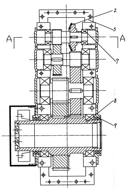 | 一種高油位自潤滑減速機,它有多級齒輪傳動,其特征在于,在高位的第一級傳動中采用相互垂直的錐齒輪與錐齒軸嚙合傳動,錐齒軸的另一端為輸入端,在錐齒軸的輸入端及末級傳動的輸出軸出軸處均采用雙油封密封,上述第一級傳動直接浸泡在潤滑油中,實現(xiàn)濺油潤滑方式。 |