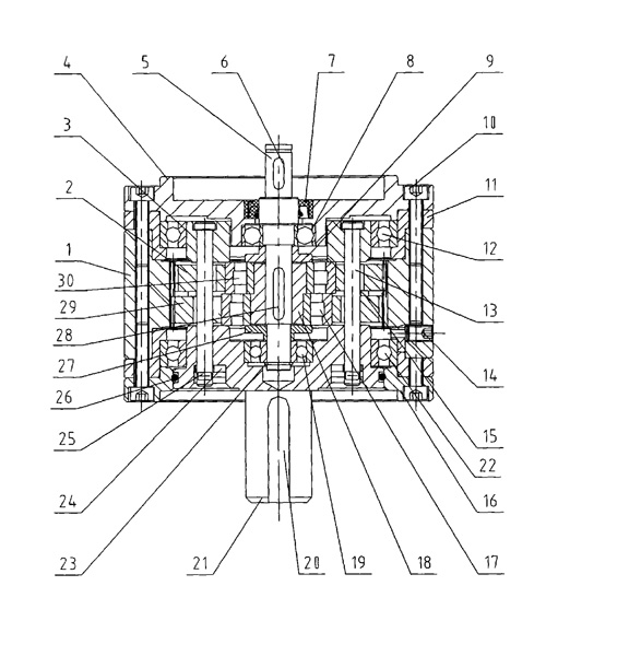 一種星輪減速機,包括輸入軸、輸出軸、齒輪、齒圈和通蓋,其特征是:減速機殼內(nèi)裝有輸入軸、輸出軸、齒輪、齒圈,輸入軸裝有偏心套(18),輸入軸(5)有雙支撐軸承(8、19),偏心套裝有兩偏心軸承(17、30),兩偏心軸承(17、30)分別裝有齒輪(2、29),兩齒輪(2、29)外聯(lián)接齒圈(1),兩齒輪(2、29)由連接銷軸(13)固定于均載盤(3)和軸出軸(21),均載盤(3)設有軸承(12),輸出軸(21)外圓與通蓋(16)間裝有密封圈。