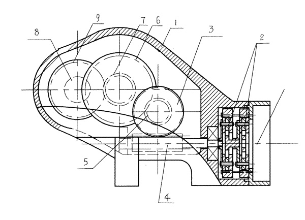 | 一種緊湊型大減速比減速機,它包括殼體和安裝在殼體內(nèi)的減速機構(gòu),其特征是:所述的減速機構(gòu)包括行星齒輪機構(gòu)、蝸輪蝸桿機構(gòu)和齒輪機構(gòu),行星齒輪機構(gòu)的輸出軸與蝸桿同軸,蝸輪與蝸桿相配合,蝸輪上固定有同軸齒輪、且該齒輪與大齒輪相嚙合,與大齒輪同軸的齒輪與輸出軸上固定的齒輪嚙合。 |